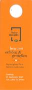 Abstract: Werbeprospekt, in Form eines "Do not disturb"-Türschildes, orange, mit dem Titel "Please disturb- bewusst erleben & genießen- Tag der offenen Tür in Südtirols Gastbetrieben", am Sonntag, 17. September 2017, mit 15 Südtiroler Gastbetrieben. Eine Veranstaltung des Hoteliers- und Gastwirteverbandes (HGV).
