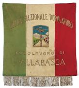 Abstract: 1 Standarte, grün-weiß-rot, mit der goldener Schrift (gestickt) "Opera nazionale Dopolavoro - Dopolavoro di Villabassa" und einer farbigen Abbildung des Liktorenbündel (fascio littorio), Symbol des Faschismus, einem Adler und der Abkürzung OND.
