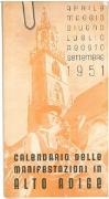 Abstract: Opuscolo pubblicitario: "Calendario delle manifestazioni in Alto Adige" relative al periodo aprile/settembre 1951. Motivo fotografico: musicisti e duomo di Bolzano (prospettiva dal basso).