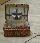Abstract: Cestino da picnic (in vimini), marrone, laccato con maniglia di trasporto in metallo e barra di bloccaggio; contiene 24 pezzi: 2 coltelli, 2 piatti piccoli bianchi, 2 piatti più grandi smaltati con bordo dorato, 1 cestino in vimini con piattino per il burro (porcellana) marchio Coracle, 1 cestino in vimini con bicchiere per bere, contenitore in plastica rosa e saliera in vetro con supporto, 1 bottiglia in vetro con tappo in metallo, 2 bottiglie in vetro in supporto di vimini, 1 barattolo per panini (porcellana) del marchio Coracle con coperchio in metallo. Il cestino da picnic e almeno i contenitori con l'impronta "Trademark Coracle Brand" provengono probabilmente dall'Inghilterra - inizio del XX secolo. Il produttore dei "set da picnic Coracle" era la società G. W. Scott & Sons. LTD.