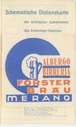 Abstract: 1 Werbeprospekt, farbig, geheftet, 32 S., "Führer Dolomiten Ortler - Brenta" aus den 1930er Jahren mit eingeklebter "schematische(r) Distanzkarte der wichtigsten Autostrassen des Dolomiten-Gebietes" auf der letzten Seite. Auf der ersten Vorderseite der Straßenkarte ist ein 2farbiger (Braun-Blau) Aufkleber vom Gasthaus "Albergo Birreria Forsterbräu Merano" aufgeklebt. Mit sw Fotografien von Bährendt, Ghedina, Joffé und Fränzl. Herausgeber ist die Union für Höhenhotels mit Sitz in Meran, Kornplatz 2. Umschlagsmotiv: farbige Grafik, signiert EM, vermutlich Erwin Merlet, Bergstraße mit Automobil vor Bergkulisse auf der Vorderseite + Mann u. Frau mit Blick auf einen Gletscher auf der Rückseite.