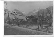 Abstract: Fotografia in bianco e nero con bordi bianchi. Merano. La "naggelte Steg" (passerella) prima della demolizione (=nel 1906 venne costruito il "Kaiserbrücke", oggi, ponte Teatro). Sono altresì visibili, da sx a dx della foto: la chiesa protestante, la pensione Radetzky (dopo la prima guerra mondiale rinominata Hotel Royal); segue, una piccola casetta, presumibilmente, riferibile alla bottega del fabbro Anton Steiner, che fu poi trasformata in pensione (Schönblick); la pensione Neuhaus (la "vecchia Neuhaus"); Villa Fortuna (al suo posto venne poi costruita la "nuova Neuhaus", tutt'oggi in loco) e dietro, è visibile una parte dell' Hotel Central - Piazza Rufin.