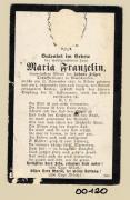 Abstract: Sterbebild von Maria Franzelin, Witwe des Johann Zelger, Tschufflerbauer in Deutschnofen Geb. am 13.11.1841 in Aldein, gest. am 04.09.1904 ohne Foto
