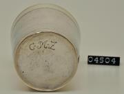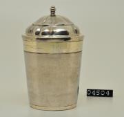 Abstract: Konische Dose aus Silber mit glockenförmigem Stülpdeckel mit Knauf, innen vergoldet. Unterseite signiert: "C.M.Z."