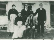 Abstract: Fotografie, schwarz-weiß, Hochformat. Inhalt: Ein Mann, vier Frauen und drei Kleinkinder (Kinder), im Hintergrund ein Haus und eine Hütte. Rückseite beschrieben: "hinten links Seeber Nanne rechts Tischl Moidl-vorne ganz rechts Kordile Mutter vorne links + Mitte Kohler VATER + Mutter. St. Peter. Kohler."