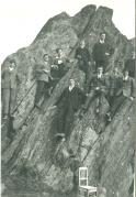 Abstract: Fotografie, schwarz-weiß, Querformat. Inhalt: Gruppe von zehn Männern verteilt auf einem Felsen, Gruppenfoto. Im Vordergrund ein Stuhl. Rückseite beschrieben: "Die – Brunnmando - ban Juchazstoane."