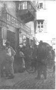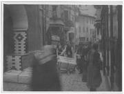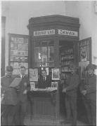 Abstract: Fotografia in bianco e nero con bordini bianchi. Merano. Filiale di S. Pötzelberger pr. la stazione. Venditori/commessi Heinr. Weber ed Ernst Vasak al cambio turno; in foto anche due carabinieri ed un soldato italiano.