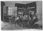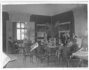 Abstract: Fotografia in bianco e nero con bordini bianchi. Merano. Sala di lettura nel Kurhaus, primavera 1918. Sul retro immagine, una nota a matita scritta a mano, datata 25.11.18.
