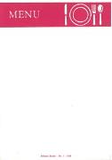 Abstract: Carta menù, in bianco, con striscia color bordeaux e la stampa in negativo: "Menu". Sul lato dx della medesima linea, una rappresentazione grafica di un piatto con le posate. La carta menù, aderisce su un pacchetto complessivo di carte (confezione).