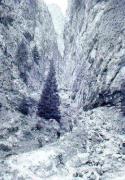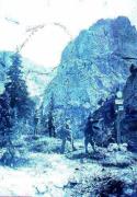 Abstract: Vier Wanderer in einer engen Schlucht, wahrscheinlich am Rosengarten.