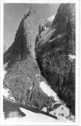 Abstract: Grasleitenhütte (Rifugio Bergamo) mit Blick auf das Massiv des Valbon-Kogels (Rosengarten). Vor der Schutzhütte halten sich zwei Männer auf. Grasleitental.