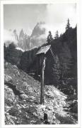 Abstract: Wanderer vor Kruzifix mit Fugur des Erlösers, vor der Sellagruppe, wahrscheinlich oberhalb von Plan des Gralba, an der Wolkensteiner Seite des Sellamassivs.