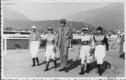 Abstract: Meran - Untermaiser Pferderennplatz - Pferderennen - Die Amazoninen Fräulein Panse, Fräulein Neuman, Fräulein Pauli Schmid und Fräulein Hellenbrand mit dem deutschen Journalisten R. Ziegler