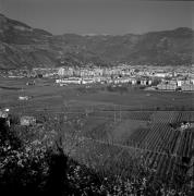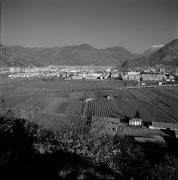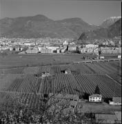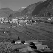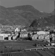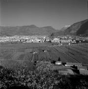 Abstract: Ausschnit des Obstbaugebietes Kaiserau bei Bozen, gegen die Wohngegend um die Reschenstraße. Im Mittelfeld des Bildes die auf Stützen gebaute neue Trasse der Eisenbahn Bozen-Meran. Foto Jänner 1998.