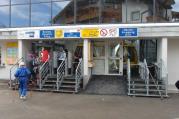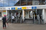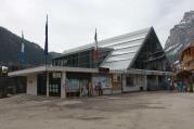 Abstract: Detail des Eingangsbereichs und des Kassengebäude an der Talstation der Gondelbahn "St. Kassian-Piz Sorega"; Skifahrer, Hinweistafeln; im Hintergrund Valparola Pass