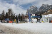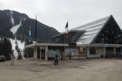 Abstract: Eingangsbereich und Kassengebäude an der Talstation der Gondelbahn "St. Kassian-Piz Sorega"; Skifahrer, Hinweistafeln