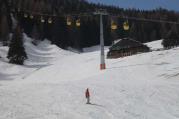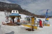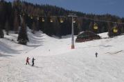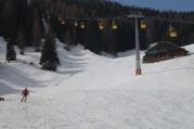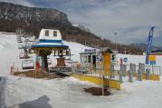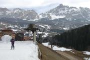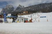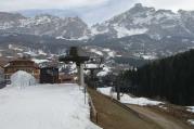 Abstract: Sessellift "Doninz" in La Villa/Stern mit Talstation, Skipiste und Skifahrern, im Hintergrund ein Hotel und ???
