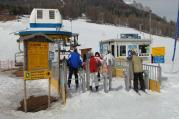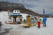 Abstract: Detail der Talstation des Sesselliftes "Doninz" in La Villa/Stern: Skifahrer beim Zugang zum Einstieg