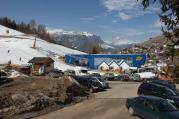 Abstract: Talstation des Sesselliftes "Doninz" in La Villa/Stern mit Hinweistafeln und Transparenten, im Hintergrund ???