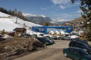 Abstract: Blick auf die Talstation der Gondelbahn "St. Kassian-Piz Sorega" mit davorliegendem Parkplatz und geparkten Autos, im Hintergrund St. Kassian und Valparola Pass
