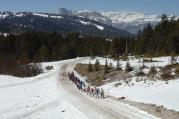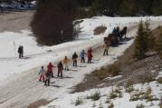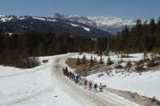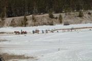 Abstract: Pferdeschlitten mit Skifahrern im Schlepptau, von vorne gesehen