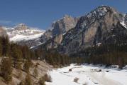 Abstract: Pferdeschlitten mit Skifahrern im Schlepptau Richtung Puez Gruppe und Sass Songher