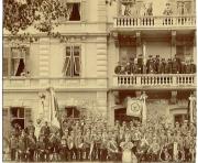 Abstract: Meran, Gruppenbild mit Bürgermeister, Musikkapelle und Feuerwehr beim Hotel Central