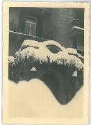 Abstract: Fotografia, b/n, con bordino decorativo bianco, raffigurante una veduta parziale dell'ingresso innevato dell'Hotel Regina di Merano.