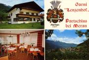 Abstract: Cartolina a colori multi-immagine raffigurante il Garni Lenzenhof visto dalla parte est del giardino; la sala da pranzo (in basso a sinistra); in basso, a destra, Parcines vista da est, direzione Val Venosta. In alto a destra, il nome della struttura con lo stemma della famiglia Schönweger.