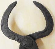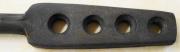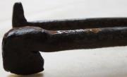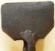 Abstract: Locheisen oder auch Nageleisen zum Schmieden der Nägel. Flaches trapezförmiges Brett mit einem rundlich geformten Griff, vesehen mit vier Löchern im Kopfteil