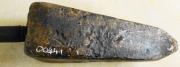 Abstract: Schmiedwerkzeug aus Eisen mit einem Holzgriff, vorne befindet sich ein pyramidenförmiger Keil.