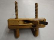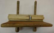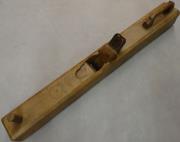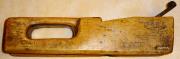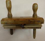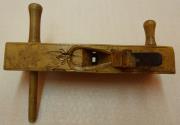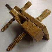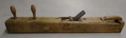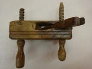 Abstract: Grundhobel mit Gewinde. Hat ein über die Hobelsohle stehendes schmales aber dickes Eisen. Zum Hobeln von Gratnuten. Mit Seiten – und Tiefenanschlag. Das Hobeleisen ist mit einem Holzkeil fixiert. Die Griffe sind unterschiedlich gedrechselt. Das dritte Gewinde in der Mitte fehlt (Loch). Das Holz ist poliert