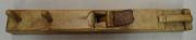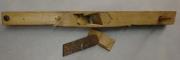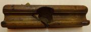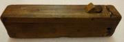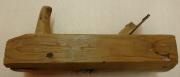 Abstract: Hobel mit seitlichem Gewindstock, unter anderem zum Hobeln von Gratnuten (Fassbinder). Die Holzverkleidung misst mehr als die doppelte Länge des Hobels selbst. Das über die Hobelsohle stehende Eisen ist flach abgestuft und ist mit einem Holzkeil fixiert. Die Griffe sind gedrechselt. Auf der Oberfläche eingeritzt: "G C/18 06". Mittig Zierung