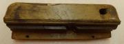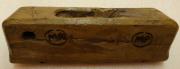 Abstract: Schrupphobel. Dient zum Ebnen des Sägeschnittes und Herstellen der geplanten Werkstückdicke. Das weit herausstehende gerade Hobeleisen hat eine segmentbogenförmige Schneide. Auf dem Hobeleisen ein nicht mehr eindeutig zu identifizierendes Firmensignet. Der Hobel hat zwei Holzkeile und einen nasenförmigen Griff. Die seitliche Leiste wurde nachträglich grob angenagelt (Risse im ursprünglichen Hobel)