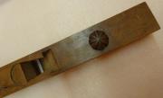 Abstract: Putzhobel. Mit nasenförmigem Griff und nach hinten abschließender halbrunder Sohle. Das gerade, etwas breitere Hobeleisen ist mit einem Holzkeil fixiert, das Hobeleisen trägt ein nicht zu identifizierendes Firmensignet. Auf der Oberseite Verzierungen (Tiefrelief) und an den Seiten geritzte Borde