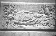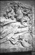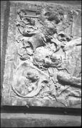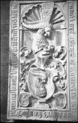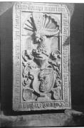 Abstract: "Wappenstein an der Pfarrkirche"; Grabstein des Hans Mamminger (auch Hanns Meminger, gestorben 1458) in der Pfarrkirche zum Heiligen Nikolaus in Meran, aufgenommen im Jahr 1931. Der Grabstein zeigt ein großes Wappen mit Helmzier, flankiert von zwei kleinen Wappen, in einer Nische mit Muschelbogen; rundherum findet sich eine Inschrift in Minuskelinschrift. Der Stein soll von Hans Sebald Bocksdorfer als Ersatzstein für den 1458 verstorbenen Hanns Meminger (Hans Mamminger) angefertigt worden sein.
