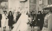 Abstract: Meran - Pfarrplatz - Hochzeit von Margherita Kebat und Mario Ghibaudi. Die Braut wird in die St. Nikolaus- Pfarrkirche geleitet. Li. im Bild die Schwester Maria Kebat, ganz re. stehend der Bruder Leopold