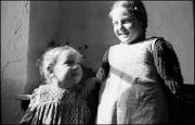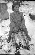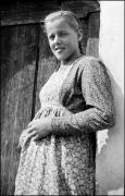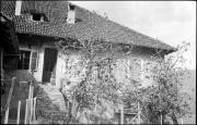 Abstract: Andrian, Wieser, Frontseite des Hauses, auf der Treppe vor der Eingangstür sitzt ein Kind, an der Hauswand Bäume