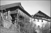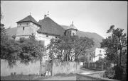 Abstract: Ansitz Steinburg (Sophienschlössl, Söll-Haus) mit Ochsenaugen unterm Dach, Erkertürmen und polygonalem Erker in Aufhofen (Gemeinde Bruneck) im Jahr 1935, in Richtung Westen aufgenommen, umgeben von Mauern; am Eingang drei kleine Kinder mit Kittelschürzen, rechts Widum/Ansitz Mohrenfeld mit seinen Ochsenaugen im Dachgeschoss, im Hintergrund St. Georgener Kofel, Rauchkopf und Scheibe.