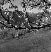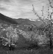 Abstract: Obstwiese in Blüte bei Meran, gegen Ausschnitt der Texelgruppe.