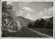 Abstract: "Abschnitt der Staatsstraße Bozen-Meran irgendwo in der Terlaner Gegend, mit fahrendem Auto; auf beiden Seiten der Straße blühende Obstbäume."