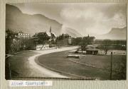 Abstract: Meran - Blick vom Franz Ferdinand- Kai, der heutigen Manzonistraße, gegen die evangelische Kirche, die Pension Radetzky und das Schlosser Steiner- Haus an der Stephanie Promenade (heute Passerpromenade)