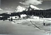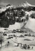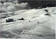 Abstract: Skipisten mit Skifahrern unweit des Seiser Alpenhauses (Dialer), vorne Holzhütte.