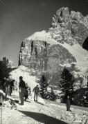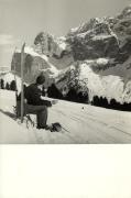 Abstract: Gruppe von Skifahrern vor Ausschnitt der Sellagruppe.