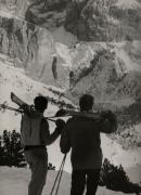 Abstract: Zwei Skifahrer mit Skiern auf den Schultern am Fuße des Sellastockes.