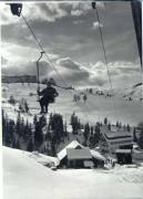 Abstract: Hotel Pitz im Winter und Sessellift zur Ikarushütte (darauf Skifahrer auf Sessel sitzend). Blick gegen Schlern.