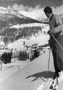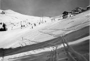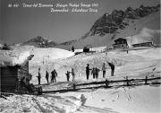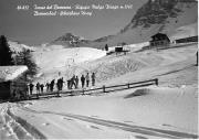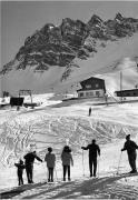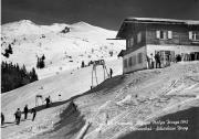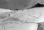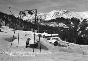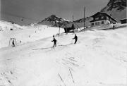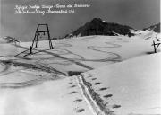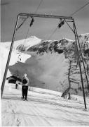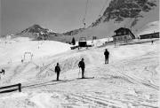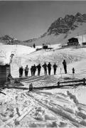 Abstract: Skifahrer an der Talstation eines Liftes, möglicherweise im Gebiet Brenner-Gossensaß, wahrscheinlich Hühnerspielalm.
