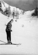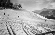 Abstract: Ausschnitt aus Skigelände bei Gossensaß (1100 m.), mit Skifahrern.