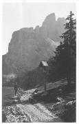 Abstract: Wanderer vor Kruzifix mit Fugur des Erlösers, vor der Sellagruppe, wahrscheinlich oberhalb von Plan des Gralba, an der Wolkensteiner Seite des Sellamassivs.