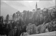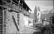 Abstract: Geiselsberg (Olang) mit Arndt-Hof (auch Springerhof genannt), Widum, Kirche (Pfarrkirche zum Hl. Wolfgang, geweiht 1484) und Messnerhaus Richtung Südwesten, im Hintergrund Flatschkofel und Dreifingerspitze.